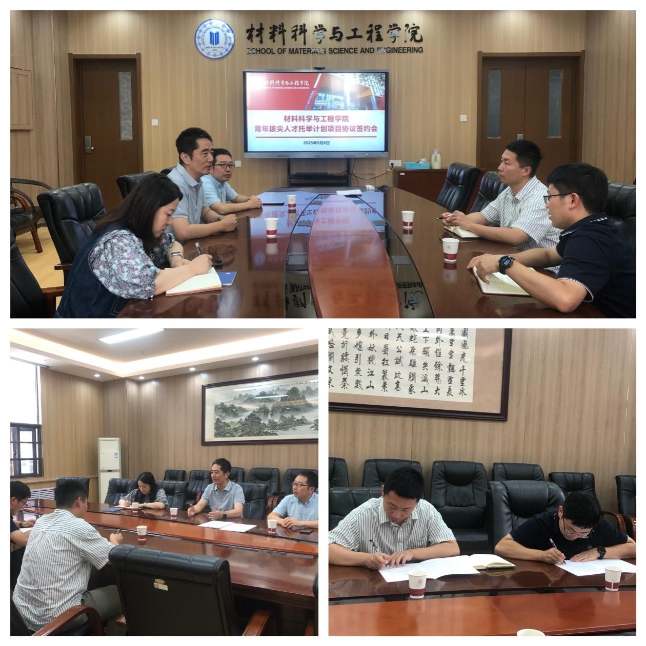 9月8日,材料科学与工程学院在致知楼2313会议室举行青年拔尖人才托举计划项目签约仪式,启动了学院第二轮高层次青年人才培养工程。学院院长曾京辉、副院长刘治科、党政办主任张雯谦,入选青年教师代表出席会议。