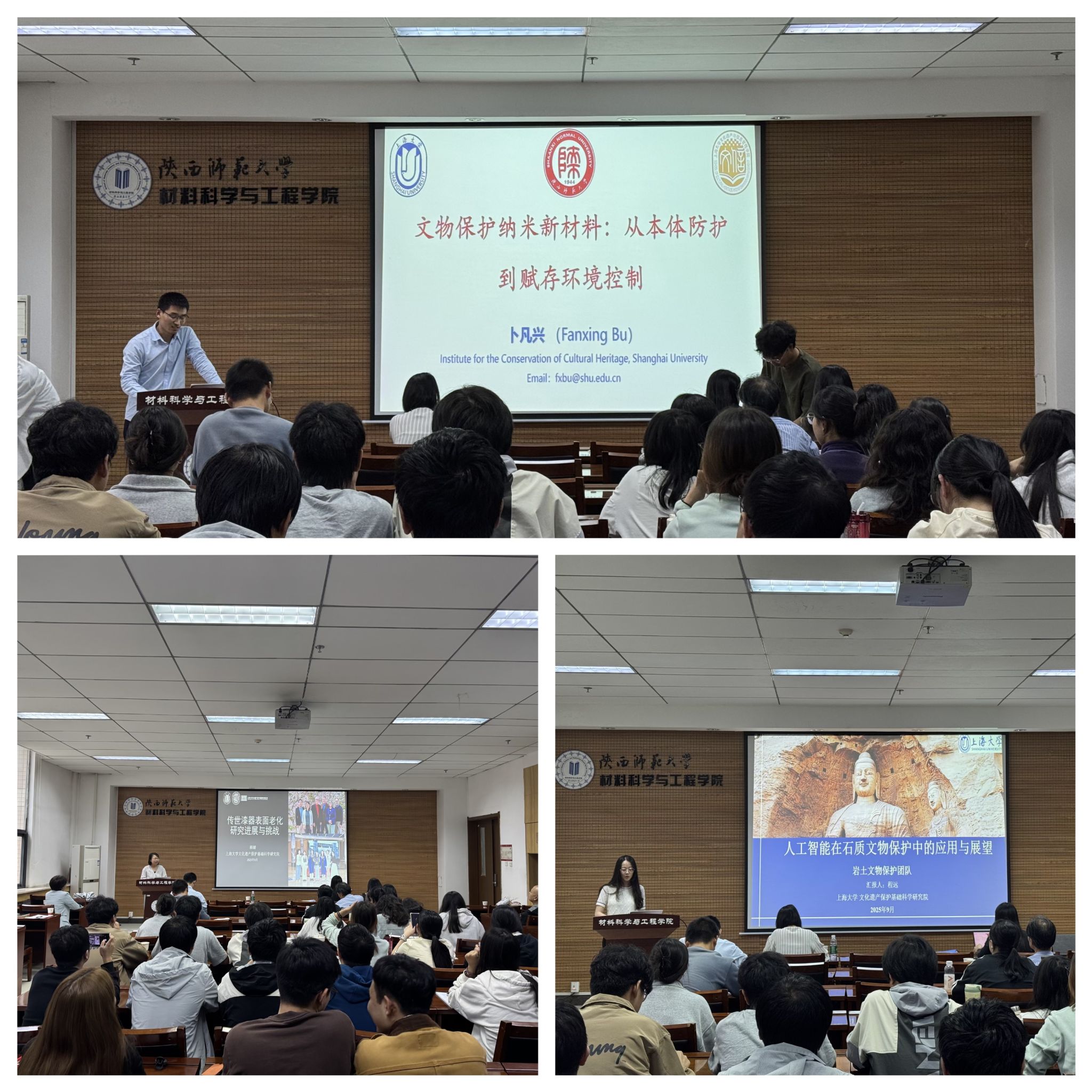 上海大学三位青年学者分别在2307报告厅作了学术报告。卜凡兴副研究员做了《文物保护纳米新材料:从本体防护到环境控制》的学术报告,阐述了团队在石窟防风化加固、纸质文物脱酸加固及环境控制材料领域的研究进展,他重点围绕杂化硅氧烷低聚物、磷酸钙低聚物、介孔MOFs等新型材料的设计合成,解析了材料介微结构与文物的交互作用对保护性能的影响,为文物劣化问题提供了新材料解决方案。韩婧副研究员以《传世漆器表面老化机理研究进展和挑战》为题,分享了其在漆器文物光老化机理与保护修复方面的最新研究成果,她指出漆器作为东亚及东南亚古代重要器物与海外珍贵藏品,对光照极为敏感,光照引发的外观与性能变化给保护展示带来巨大挑战,报告深入探究了漆面老化过程中的形貌、成分演变规律,同时分享了团队在漆工艺科技考古领域的最新突破。程远老师以《人工智能在石质文物保护中的应用与展望》为题,结合自身长时序影像处理研究经验,详解了人工智能技术的实践价值:深度学习模型可自动提取石质文物风化、裂隙等病害特征,机器学习算法能从环境与检测数据中分析保存状态,为预防性保护提供支持。