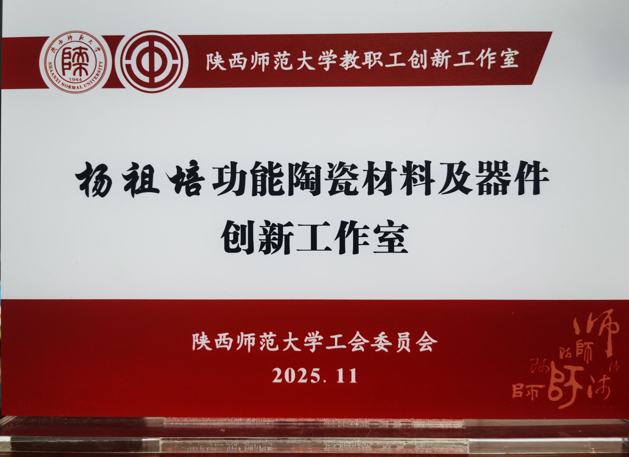 近日,学院“杨祖培功能陶瓷材料及器件创新工作室”入选学校教职工创新工作室。学校于11月20日在长安校区举行了授牌仪式,校党委副书记卢胜利为工作室授牌,校工会主席蒋毓新主持仪式,学院党委书记秦文静、院工会委员王大鹏及团队代表彭战辉参加活动。