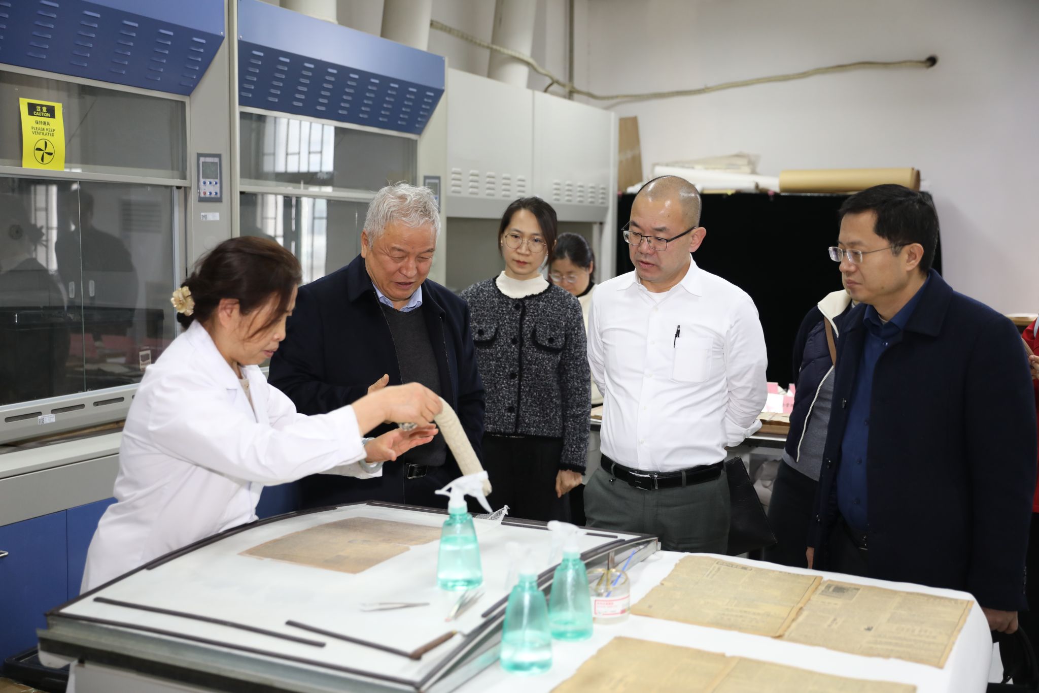 调研组实地考察了我校历史文化遗产保护教育部工程研究中心环保防灾耐久档案盒和封存箱的研发与应用,并与科研团队进行了座谈。